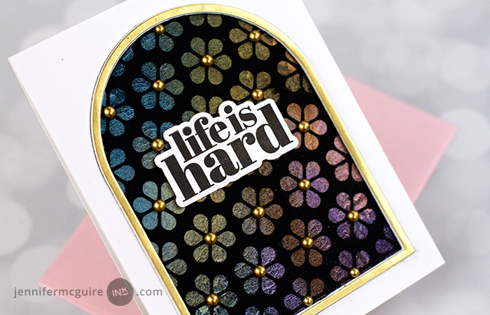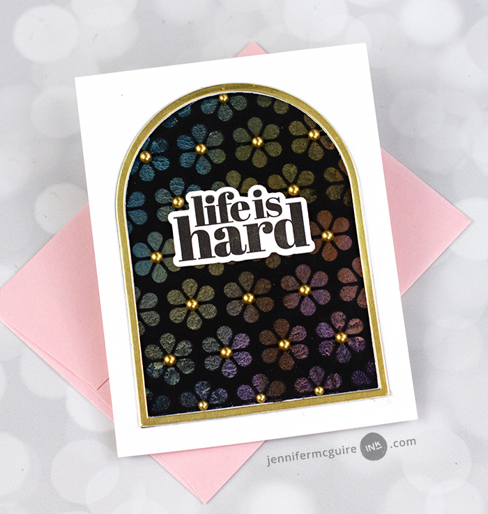 View Card Bookmark Card LIFE IS HARD CARD – Using Distress Spritz with embossing folders.
